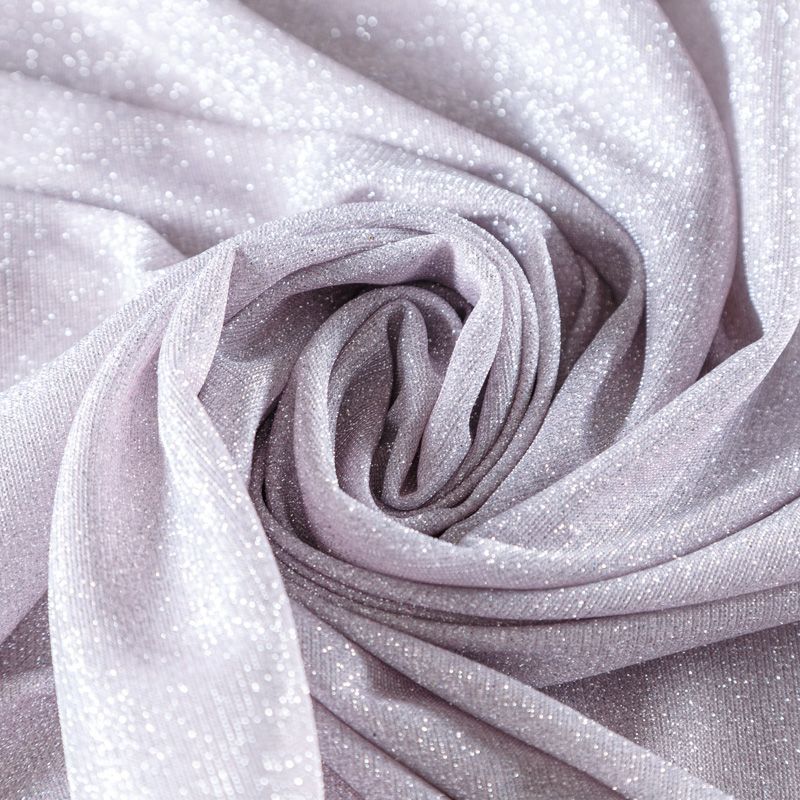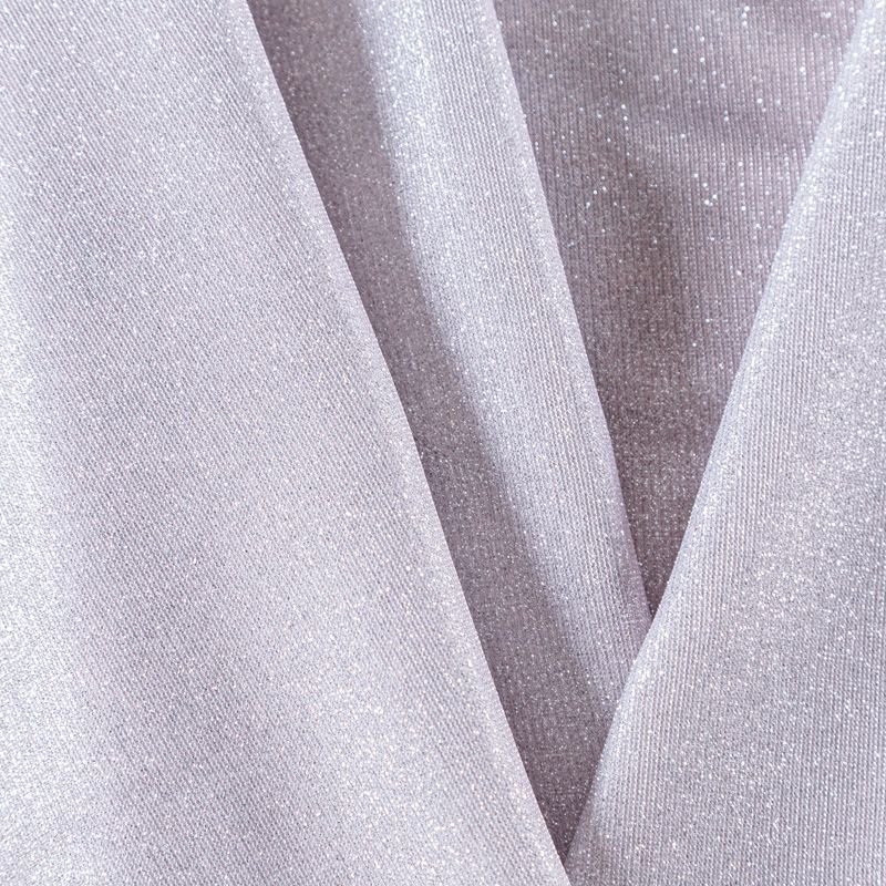Трикотажное полотно средней плотности с добавлением серебристой люрексной нити. Поверхность шероховатая на ощупь, ткань пластичная, хорошо тянется, не просвечивает. Прекрасно подойдет для пошива лонгслива, гольфа, футболки, кардигана, жакета, платья или юбки в спортивном стиле.