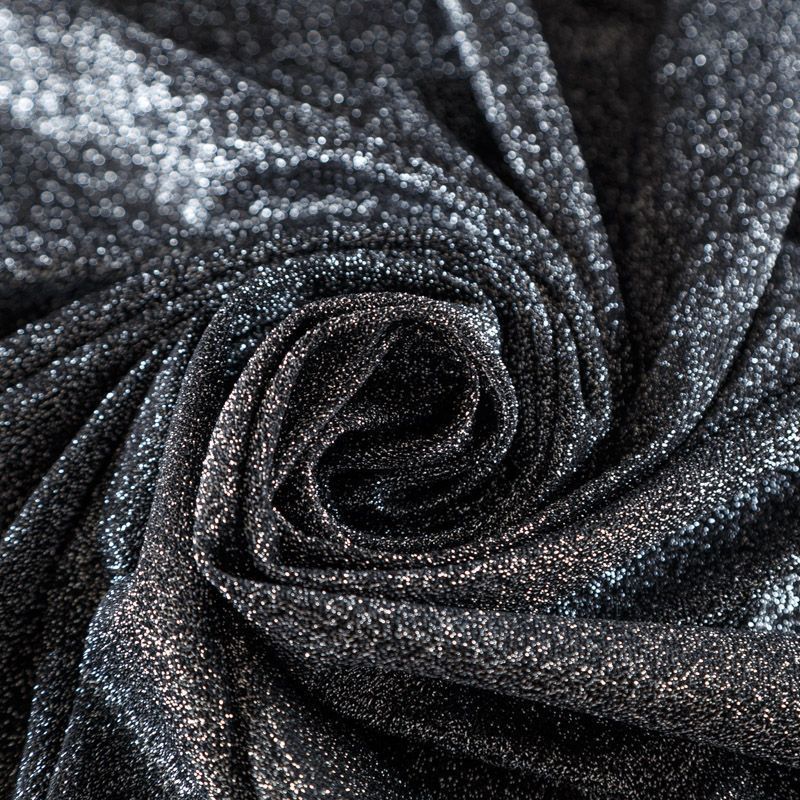Трикотажное полотно с металлизированным блеском и  мерцанием. Люрексные нити вплетены в структуру полотна и создают объемный "вспененный" эффект, при этом изнанка гладкая и ровная. Ткань очень приятная к телу, не колется, не просвечивается, очень эластичная, отлично драпируется и ниспадает, красиво ляжет по фигуре. Идеальный вариант для пошива вечерних и нарядных платьев облегающего и свободного силуэта, топов, комбинезона, юбки, широких брюк, туник, кардиганов, накидок.