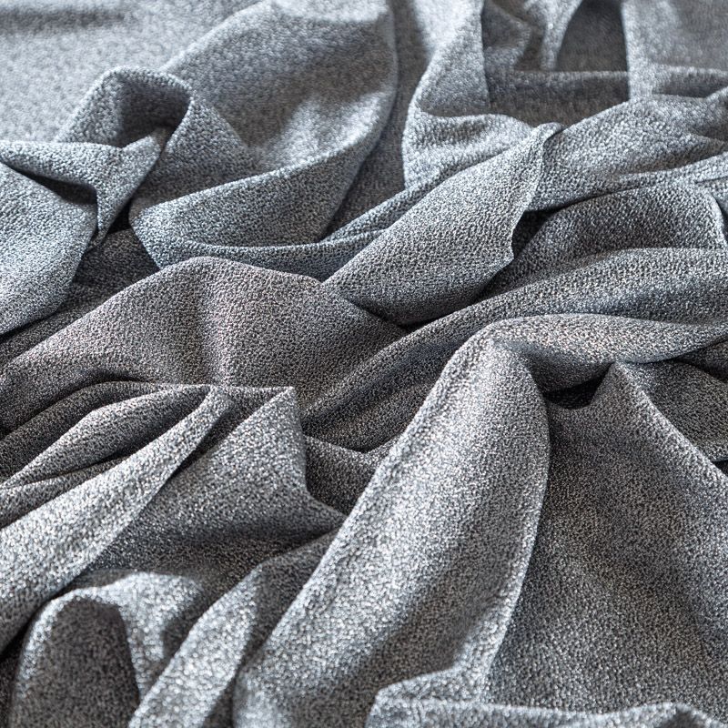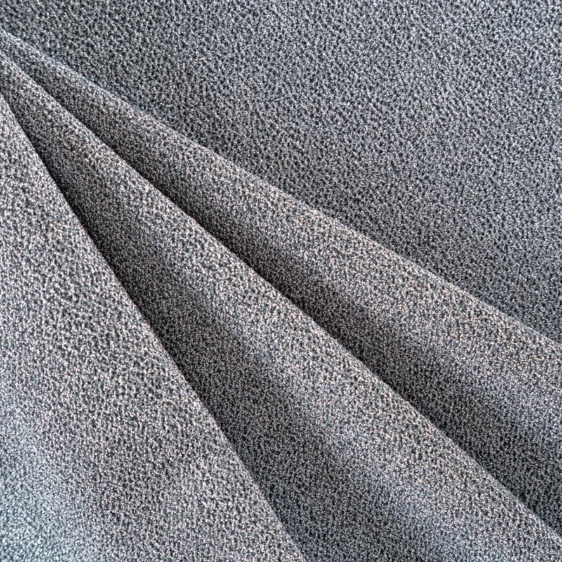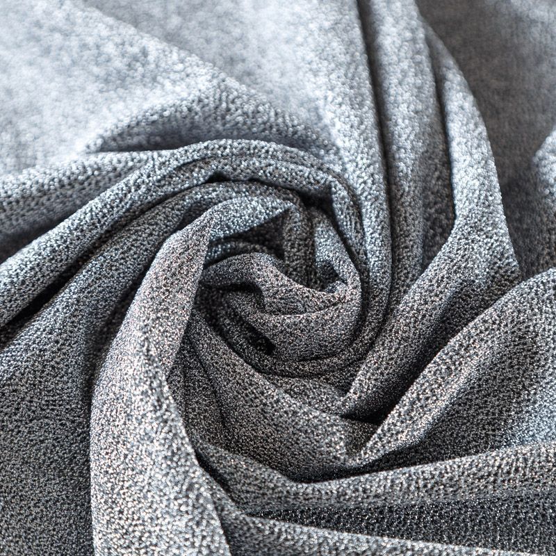Трикотажное полотно с металлизированным блеском и  мерцанием. Люрексные серебристые нити вплетены в структуру полотна и создают объемный "вспененный" эффект, при этом изнанка гладкая и ровная. Ткань очень приятная к телу, не колется, не просвечивается, очень эластичная, отлично драпируется и ниспадает, красиво ляжет по фигуре. Идеальный вариант для пошива вечерних и нарядных платьев облегающего и свободного силуэта, топов, комбинезона, юбки, широких брюк, туник, кардиганов, накидок.