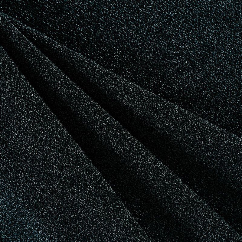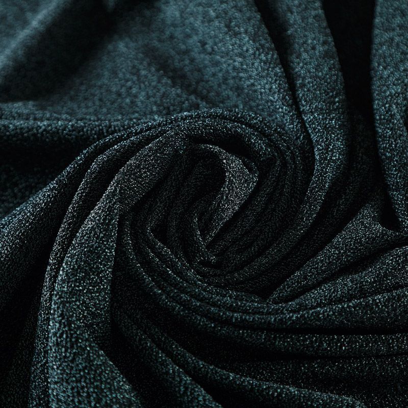 Трикотажное полотно с металлизированным блеском и  мерцанием. Люрексные нити зеленого оттенка вплетены в структуру полотна и создают объемный "вспененный" эффект, при этом изнанка гладкая и ровная. Ткань очень приятная к телу, не колется, не просвечивается, очень эластичная, отлично драпируется и ниспадает, красиво ляжет по фигуре. Идеальный вариант для пошива вечерних и нарядных платьев облегающего и свободного силуэта, топов, комбинезона, юбки, широких брюк, туник, кардиганов, накидок.