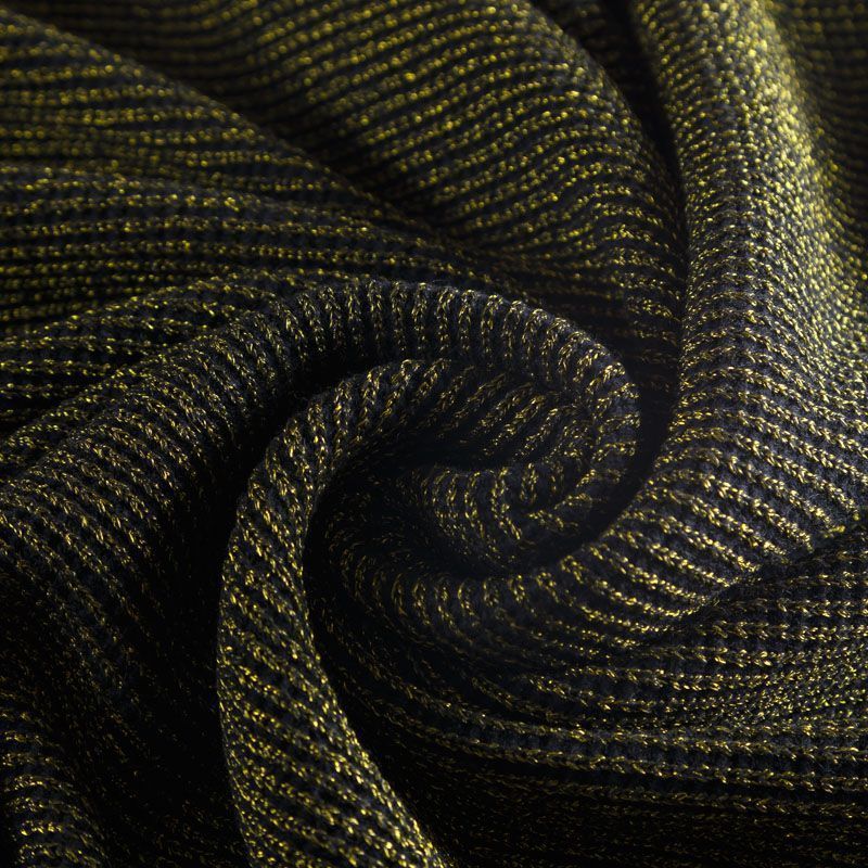 Плотный итальянский вязаный трикотаж с добавлением шерсти и золотистой люрексной нити. Полотно не рыхлое, тяжеловатое за счет плотной вязки английской резинкой, упругое, хорошо держит форму. Подойдет для пошива свитера, теплого прямого платья или юбки, жилета, кардигана, куртки, пальто или бомбера с утеплителем.
