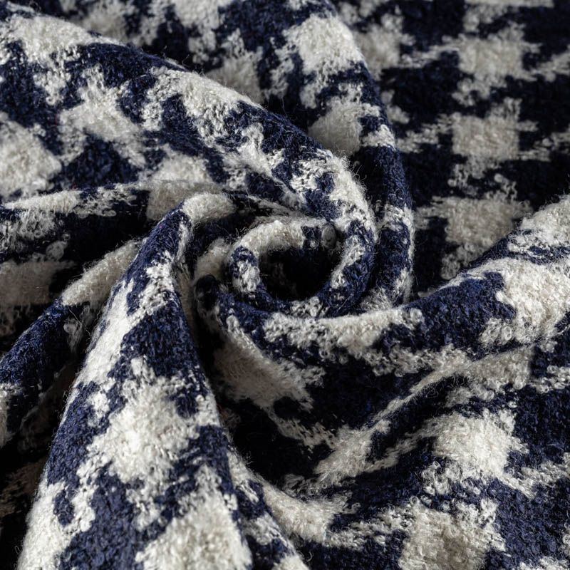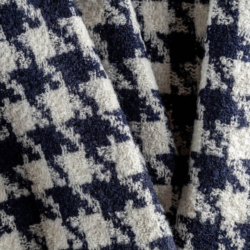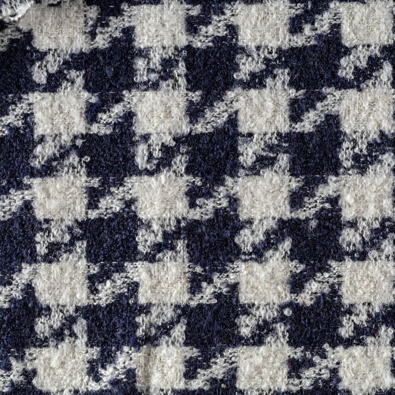 Твид с плетеной и немного буклированной поверхностью, узор "гусиная лапка" образуется переплетением темно-синих и молочных нитей. Ткань не сухая, мягкая, но плотная, не просвечивает, теплая, хоршо драпируется. Отлично подойдет для пошива верхней одежды, жакетов, костюмов, юбок.