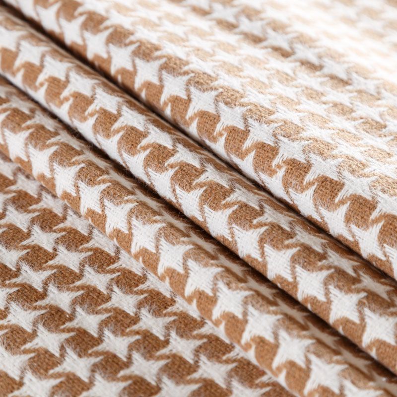 Костюмный твид с карамельного оттенка с геометрическим узором молочного цвета. Ткань плотная, мягкая, приятная на ощупь, прочная, не вытирается. Отличный выбор для осенних костюмов, облегченного пальто, куртки, бомбера, юбки, шорт или теплого платья.