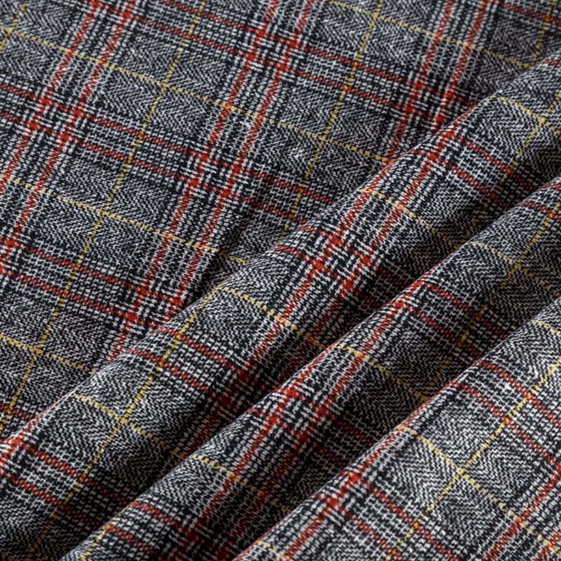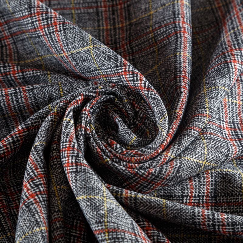 Фактурная и плотная твидовая ткань с добавлением хлопка в красивую и сложную черно-белую клетку, которую освежают тонкие полоски кирпичного и желтого оттенков. Ткань мягкая, пластичная, приятная на ощупь. Хорошо драпируется и образует формоустойчивые складки. Твид отлично подходит для пошива костюмов, пальто, пиджаков, брюк и курток, юбок, жилетов, головных уборов в классическом стиле.