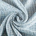 Отличительная особенность этой ткани в полотняном плетении нитей, характерного для рогожки, олицетворяющая сложную "клетчатую" геометрию в бело-голубых оттенках. Различная толщина нитей создает эффектную фактуру. Ткань достаточно формоустойчивая, при этом пластичная, гибкая за счет плетения, матовая, мягкая, приятная на ощупь, не рыхлая. Прекрасно подойдет для пошива жакета, юбки в виде трапеции, легкого пальто, костюма.