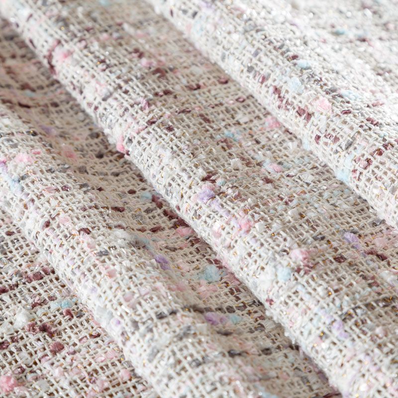 Переплетение разноцветных нитей делает эту ткань универсальной, и в тоже время оригинальной. Полотно плотное, но очень мягкое. Теплое, комфортное. Плетение рыхлое, поверхность фактурная, поэтому изделия выглядят достаточно объемно. Подойдет для пошива костюмов с юбкой, жакетов, облегченных пальто.