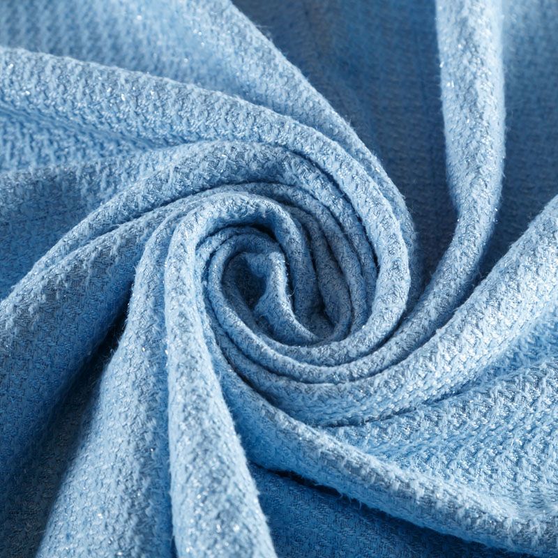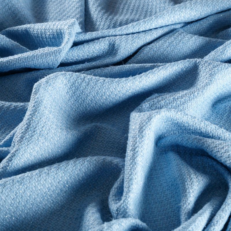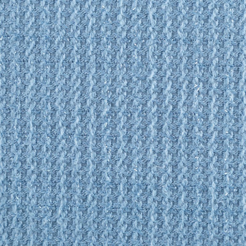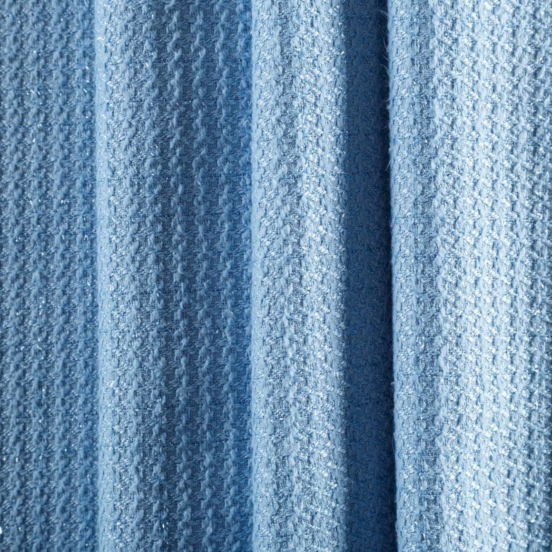 Твид средней плотности с рельефной поверхностью голубого оттенка с добавлением акцента в виде люрексовой нити, которая имитирует клетку и добавляет ткани нарядности. Твид пластичный, хорошо драпируется, умеренно держит форму, прекрасно подойдет для пошива жакетов на подкладе, жилетов, кардиганов, легких пальто, юбок и платьев.