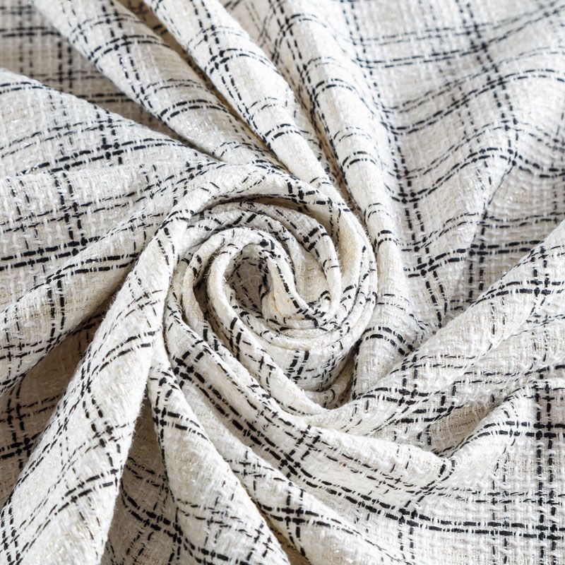 Мягкая, пластичная и объемная ткань, с разреженной и рельефной вывязанной структурой. Буклированный твид в стиле Шанель буквально соткан из различных по толщине и текстуре нитей, образующих рисунок в виде клетки. В плетение добавлена блестящая люрексная нить. Твид идеально подходит для пошива платьев, юбок, жакетов, легких пальто, эффектных бомберов и курток.