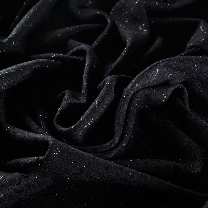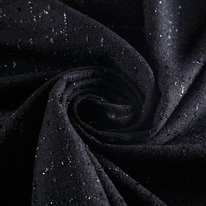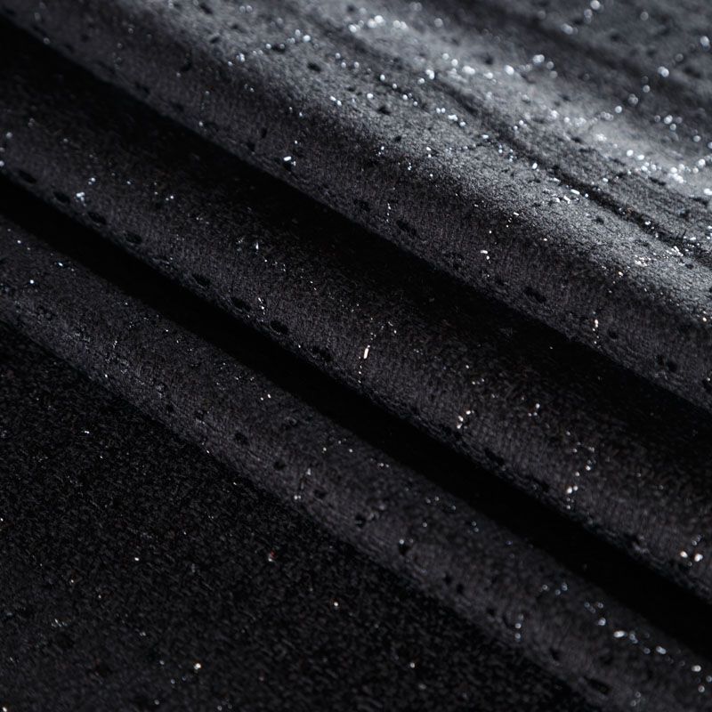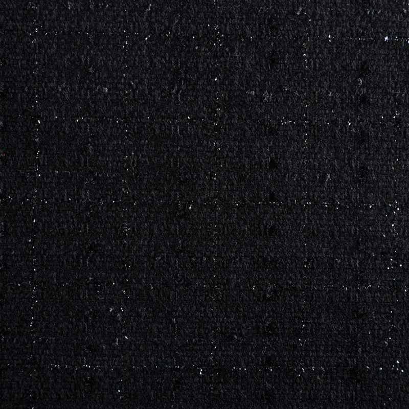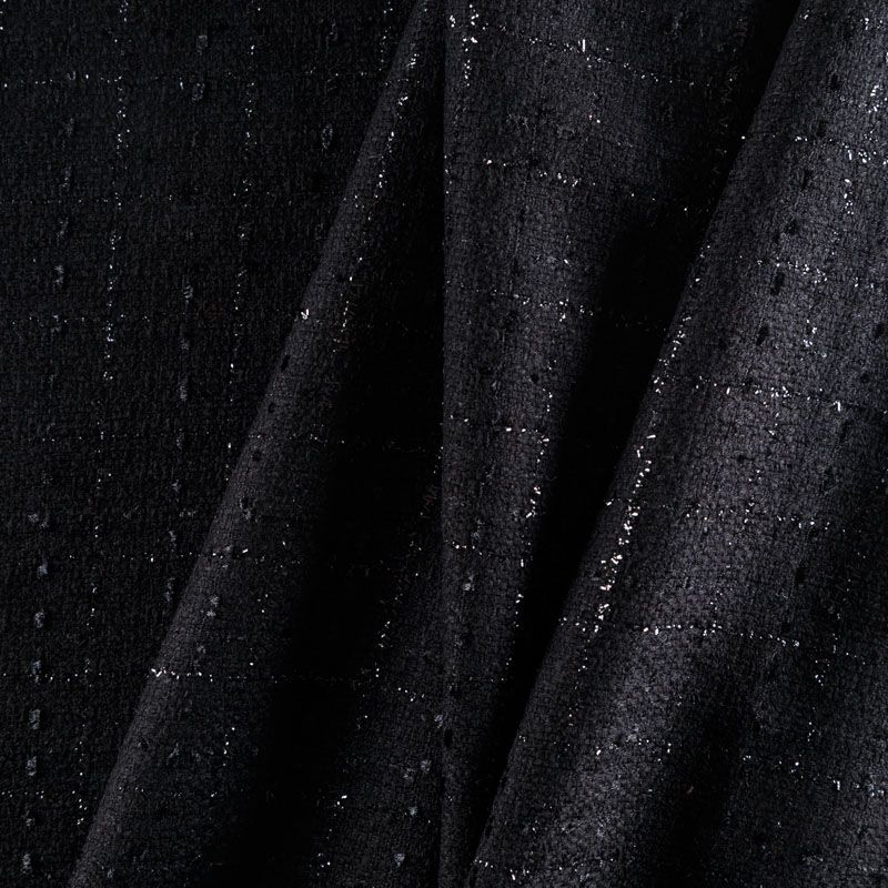 Твид средней плотности с рельефной поверхностью черного цвета с добавлением акцента в виде люрексовой нити, которая имитирует клетку и добавляет ткани нарядности. Твид пластичный, хорошо драпируется, умеренно держит форму, прекрасно подойдет для пошива жакетов на подкладе, жилетов, кардиганов, легких пальто, юбок и платьев.
