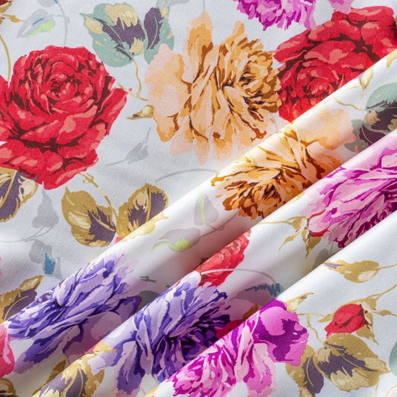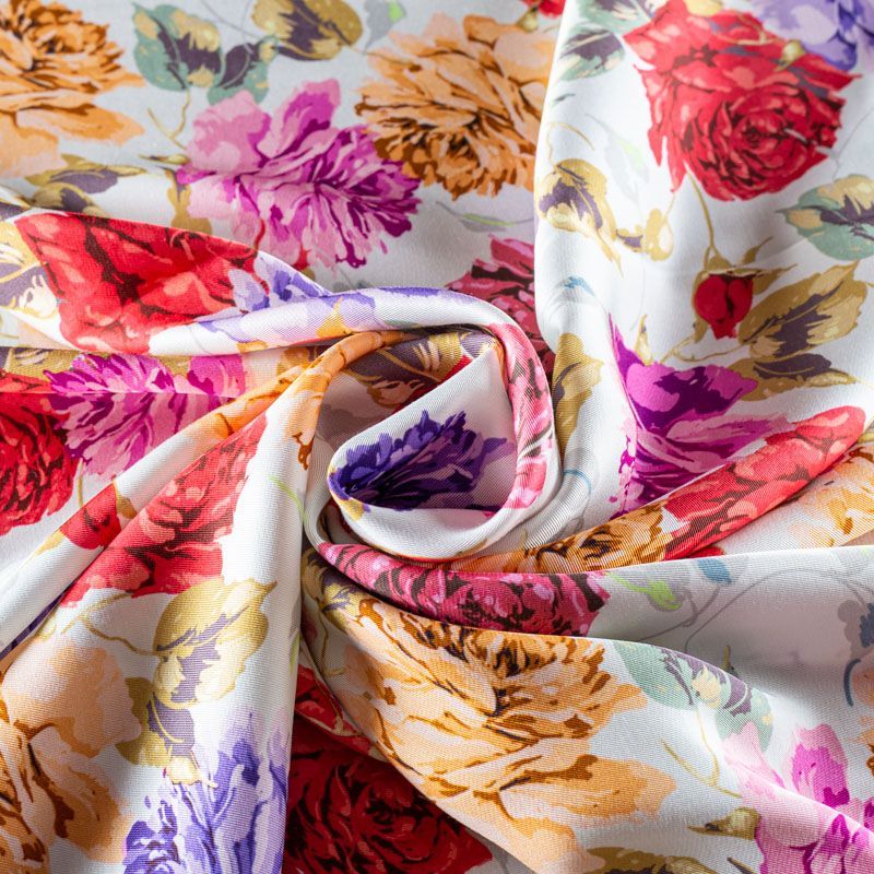 Качественный вискозный твил-штапель с цветочным принтом ярких оттенков на белом фоне. Ткань средней плотности, имеет саржевое плетение и характерный диагональный рубчик на поверхности. Хорошо сохраняет форму, не сильно мнется и не деформируется в процессе эксплуатации.  Красиво ложится в складки, поэтому прекрасно подойдет на длинные драпированные юбки и платья, туники, на свободные брюки или шорты, топы.
