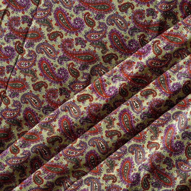 Плотная и мягкая ткань фисташкового цвета с цветным узором пейсли, имеет саржевое плетение и характерный диагональный рубчик на поверхности. Отлично сохраняет форму, не сильно мнется и не деформируется в процессе эксплуатации. Красиво ложится в складки, поэтому прекрасно подойдет на длинные драпированные юбки и платья, на свободные брюки или шорты, топы.