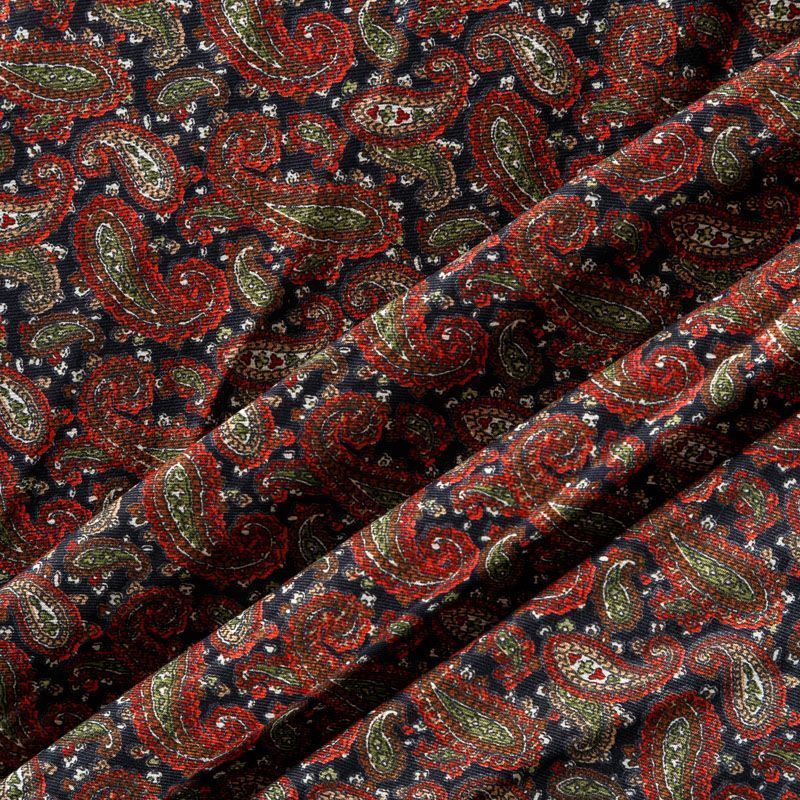 Плотная и мягкая ткань черного цвета с узором пейсли в красно-зеленых оттенках, имеет саржевое плетение и характерный диагональный рубчик на поверхности. Отлично сохраняет форму, не сильно мнется и не деформируется в процессе эксплуатации. Красиво ложится в складки, поэтому прекрасно подойдет на длинные драпированные юбки и платья, на свободные брюки или шорты, топы.