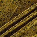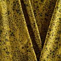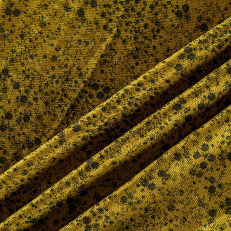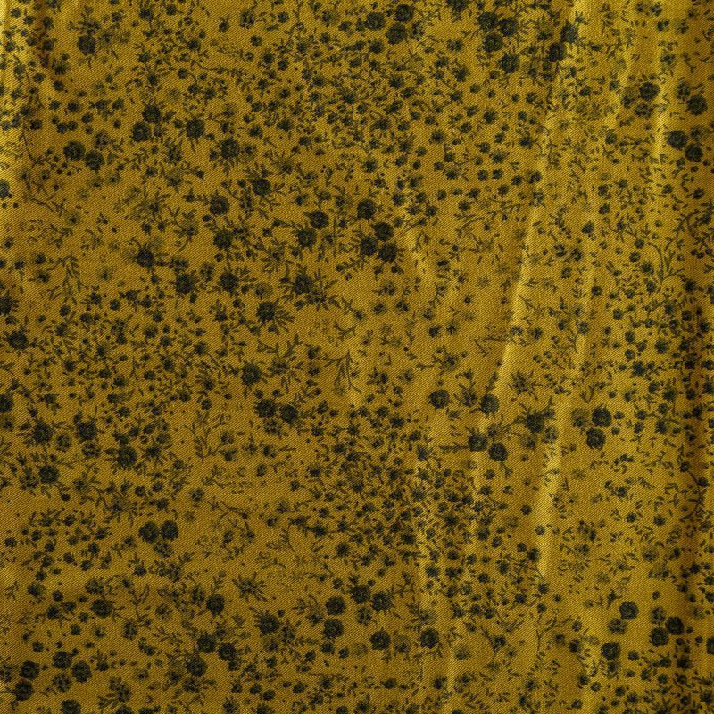 Плотная и мягкая ткань желто-зеленого оттенка с монохромным мелкоцветом, имеет саржевое плетение и характерный диагональный рубчик на поверхности. Отлично сохраняет форму, не сильно мнется и не деформируется в процессе эксплуатации. Красиво ложится в складки, поэтому прекрасно подойдет на длинные драпированные юбки и платья, на свободные брюки или шорты, топы.