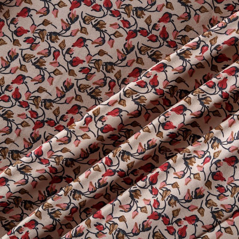 Плотная и мягкая ткань песочного оттенка с мелкоцветным принтом, имеет саржевое плетение и характерный диагональный рубчик на поверхности. Отлично сохраняет форму, не сильно мнется и не деформируется в процессе эксплуатации. Красиво ложится в складки, поэтому прекрасно подойдет на длинные драпированные юбки и платья, на свободные брюки или шорты, топы.