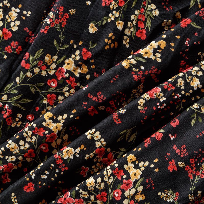 Плотная и мягкая ткань черного цвета с ярким мелкоцветом, имеет саржевое плетение и характерный диагональный рубчик на поверхности. Отлично сохраняет форму, не сильно мнется и не деформируется в процессе эксплуатации. Красиво ложится в складки, поэтому прекрасно подойдет на длинные драпированные юбки и платья, на свободные брюки или шорты, топы.