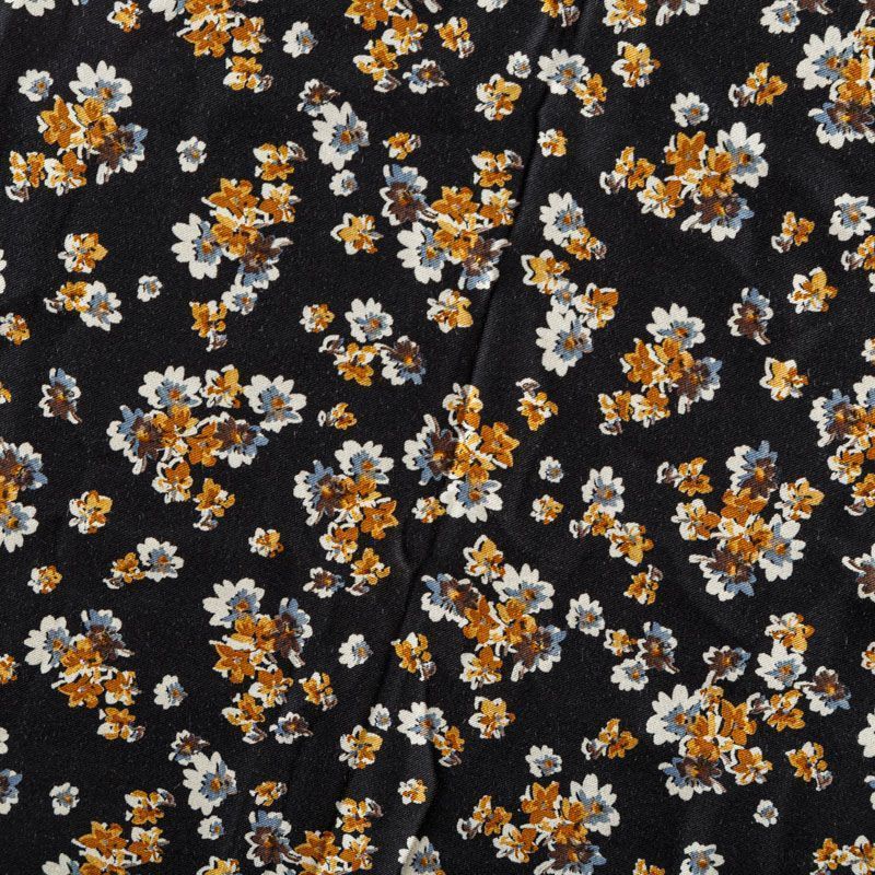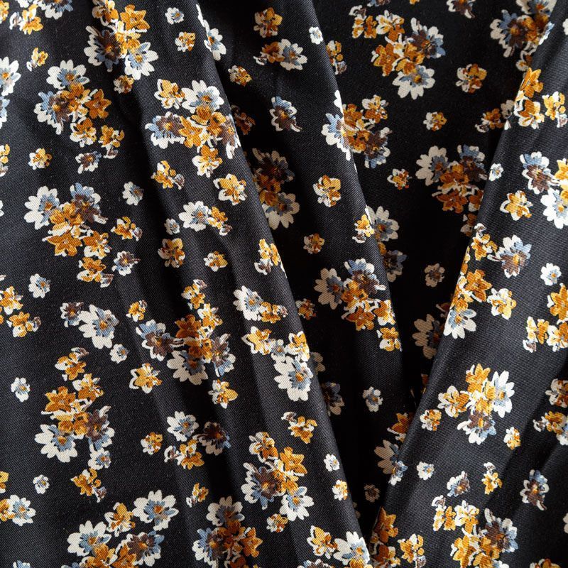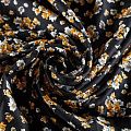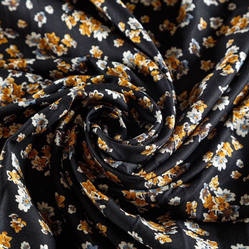 Плотная и мягкая ткань черного цвета с ярким мелкоцветом, имеет саржевое плетение и характерный диагональный рубчик на поверхности. Отлично сохраняет форму, не сильно мнется и не деформируется в процессе эксплуатации. Красиво ложится в складки, поэтому прекрасно подойдет на длинные драпированные юбки и платья, на свободные брюки или шорты, топы.