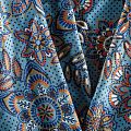 Плотная и мягкая ткань голубого оттенка со стилизованным цветочным орнаментом, имеет саржевое плетение и характерный диагональный рубчик на поверхности. Отлично сохраняет форму, не сильно мнется и не деформируется в процессе эксплуатации. Красиво ложится в складки, поэтому прекрасно подойдет на длинные драпированные юбки и платья, на свободные брюки или шорты, топы.