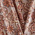 Плотная и мягкая ткань бежевого оттенка со стилизованным цветочным орнаментом, имеет саржевое плетение и характерный диагональный рубчик на поверхности. Отлично сохраняет форму, не сильно мнется и не деформируется в процессе эксплуатации. Красиво ложится в складки, поэтому прекрасно подойдет на длинные драпированные юбки и платья, на свободные брюки или шорты, топы.