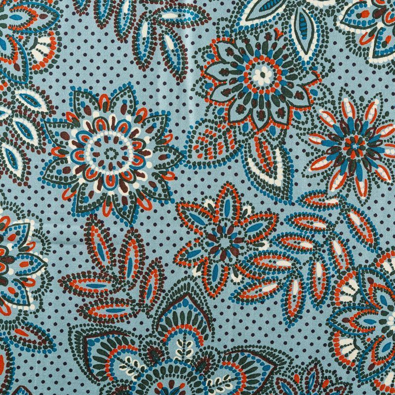 Плотная и мягкая ткань мятно-зеленого оттенка со стилизованным цветочным орнаментом, имеет саржевое плетение и характерный диагональный рубчик на поверхности. Отлично сохраняет форму, не сильно мнется и не деформируется в процессе эксплуатации. Красиво ложится в складки, поэтому прекрасно подойдет на длинные драпированные юбки и платья, на свободные брюки или шорты, топы.