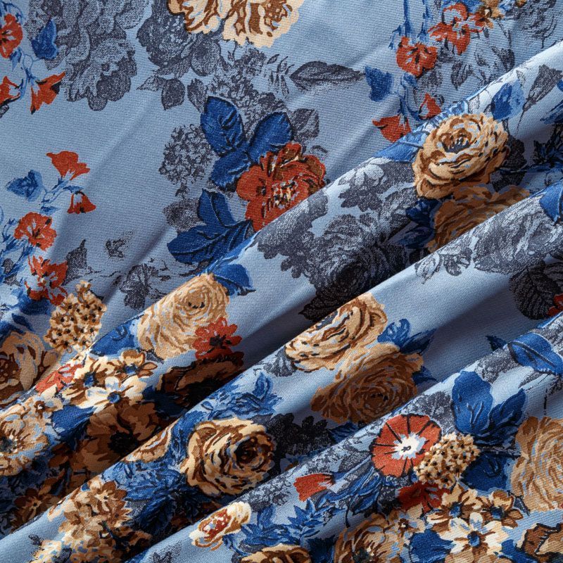 Плотная и мягкая ткань холодного голубого оттенка с цветочным принтом, имеет саржевое плетение и характерный диагональный рубчик на поверхности. Отлично сохраняет форму, не сильно мнется и не деформируется в процессе эксплуатации. Красиво ложится в складки, поэтому прекрасно подойдет на длинные драпированные юбки и платья, на свободные брюки или шорты, топы.