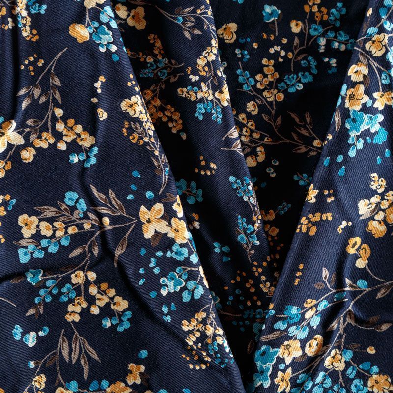 Плотная и мягкая ткань синего оттенка с ярким мелкоцветом, имеет саржевое плетение и характерный диагональный рубчик на поверхности. Отлично сохраняет форму, не сильно мнется и не деформируется в процессе эксплуатации. Красиво ложится в складки, поэтому прекрасно подойдет на длинные драпированные юбки и платья, на свободные брюки или шорты, топы.