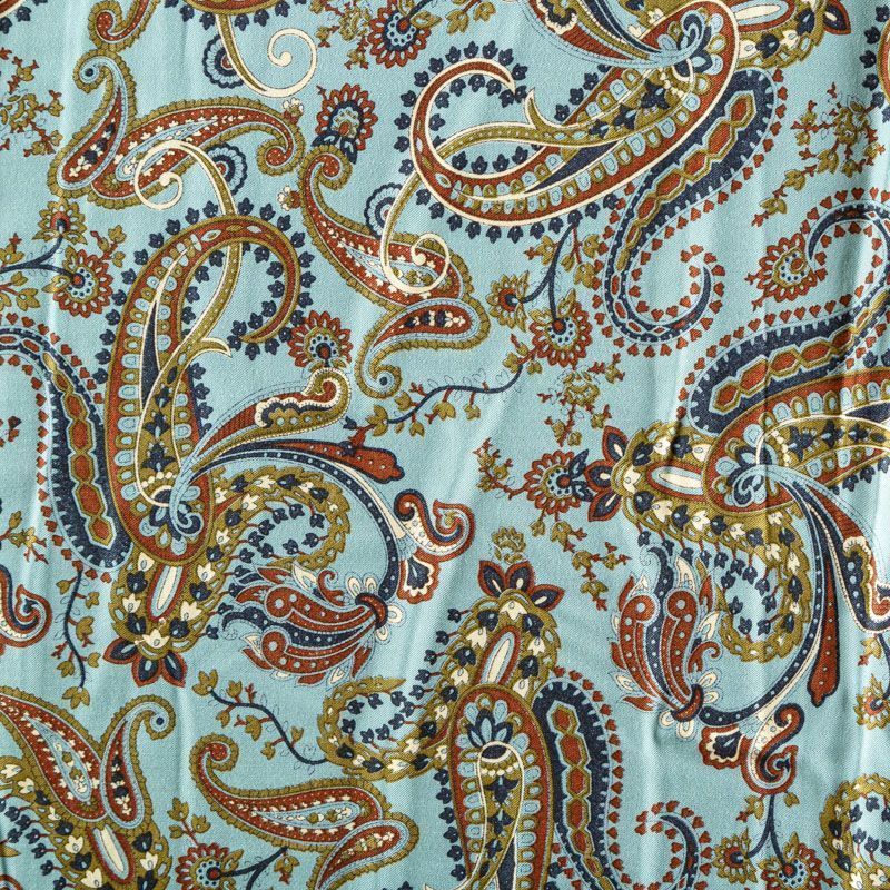 Плотная и мягкая ткань зеленого оттенка с оливково-коричневым узором пейсли, имеет саржевое плетение и характерный диагональный рубчик на поверхности. Отлично сохраняет форму, не сильно мнется и не деформируется в процессе эксплуатации. Красиво ложится в складки, поэтому прекрасно подойдет на длинные драпированные юбки и платья, на свободные брюки или шорты, топы.