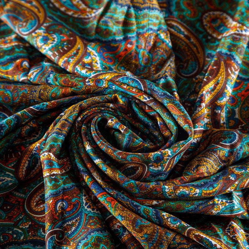 Плотная и мягкая ткань шоколадного оттенка с богатым узором пейсли в желто-синих тонах, имеет саржевое плетение и характерный диагональный рубчик на поверхности. Отлично сохраняет форму, не сильно мнется и не деформируется в процессе эксплуатации. Красиво ложится в складки, поэтому прекрасно подойдет на длинные драпированные юбки и платья, на свободные брюки или шорты, топы, комбинезоны, а также для домашней одежды.