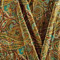 Плотная и мягкая ткань шоколадного оттенка с богатым узором пейсли в желто-зеленых тонах, имеет саржевое плетение и характерный диагональный рубчик на поверхности. Отлично сохраняет форму, не сильно мнется и не деформируется в процессе эксплуатации. Красиво ложится в складки, поэтому прекрасно подойдет на длинные драпированные юбки и платья, на свободные брюки или шорты, топы, комбинезоны, а также для домашней одежды.