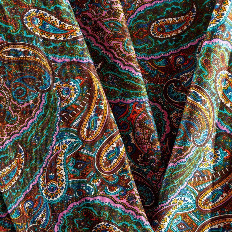Плотная и мягкая ткань сливового оттенка с богатым узором пейсли, имеет саржевое плетение и характерный диагональный рубчик на поверхности. Отлично сохраняет форму, не сильно мнется и не деформируется в процессе эксплуатации. Красиво ложится в складки, поэтому прекрасно подойдет на длинные драпированные юбки и платья, на свободные брюки или шорты, топы, комбинезоны, а также для домашней одежды.