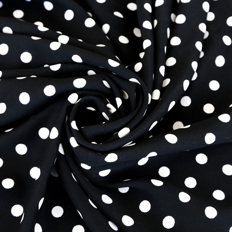 Плотная и мягкая ткань, имеет саржеве плетение и характерный диагональный рубчик на поверхности. Отлично сохраняет форму, не сильно мнется и не деформируется в процессе эксплуатации. Красиво ложиться в складки, поэтому прекрасно подойдет на длинные драпированные юбки и платья, на свободные брюки или шорты, топы. Размер гороха 1см