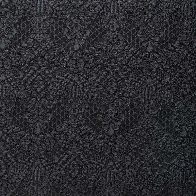 Итальянский жаккард с красивым сложным орнаментом черного цвета. Ткань легкая, но плотная, поверхность со сдержанным блеском объемная и текстурная, хорошо драпируется и держит форму, тянется за счет эластана в составе, не просвечивает. Подойдет для пошива нарядных вечерних костюмов, платьев-футляров в стиле Dior, жакетов, топов, легких пальто, бомберов, юбок или шорт.