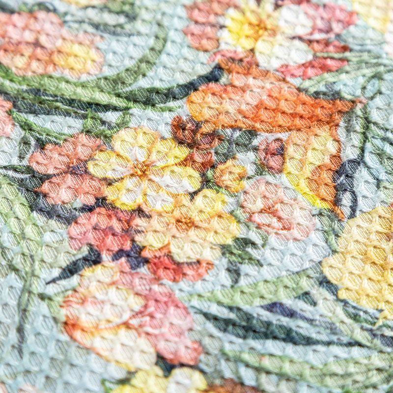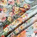 Итальянская хлопковая ткань с фактурным жаккардовым узором и цветочным принтом голубого оттенка. Ткань легкая, мягкая и приятная на ощупь, не мнется, тянется за счет эластана в составе, держит форму и ложится красивыми складками. Идеально подходит для пошива нарядных платьев, сарафанов и костюмов весенне-летнего сезона.