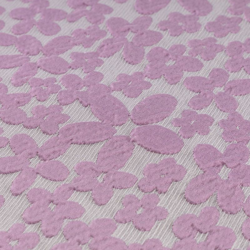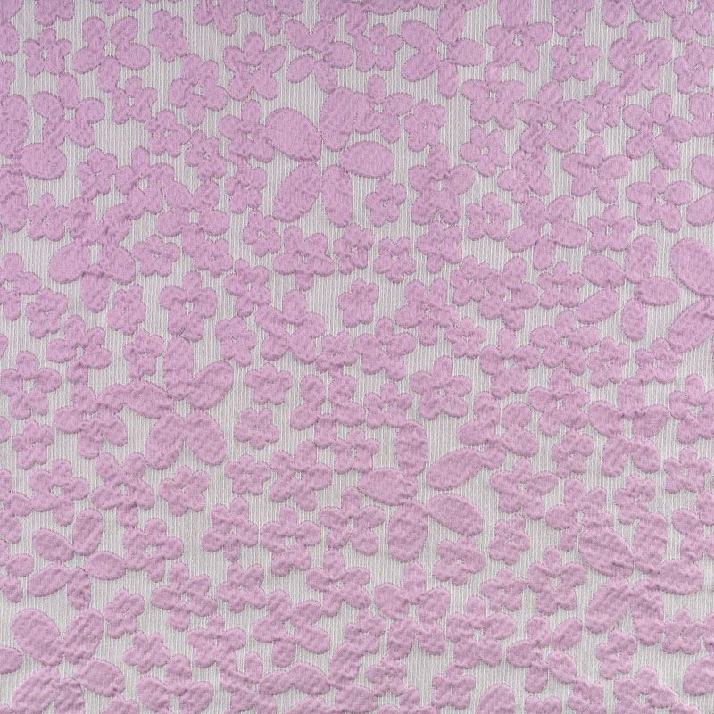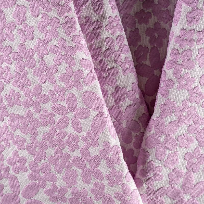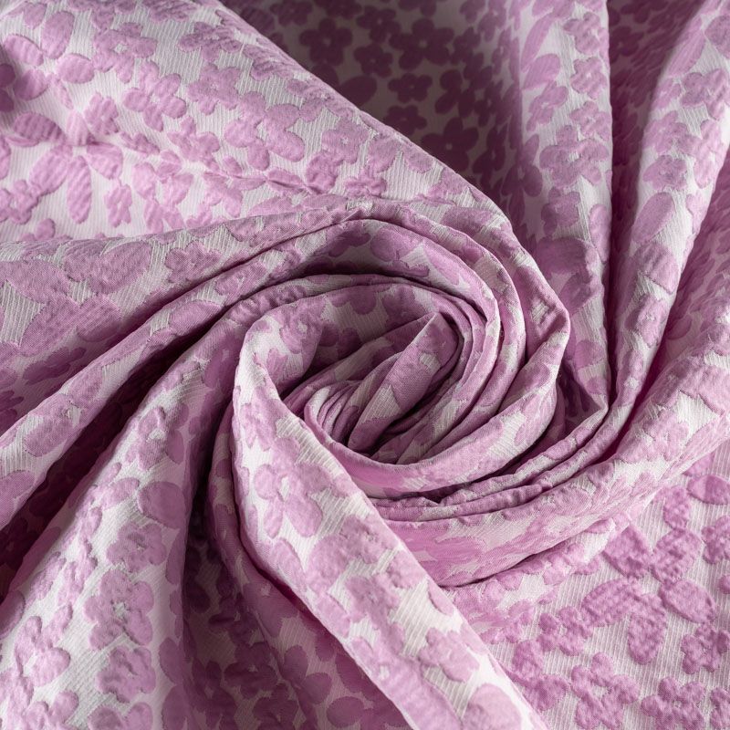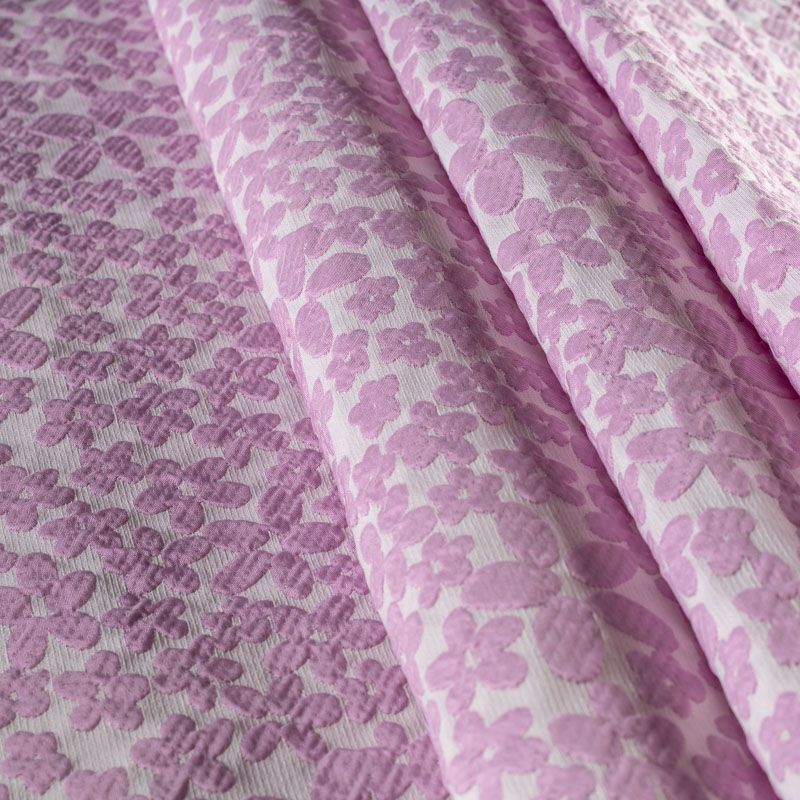 Молочный рельефный фон итальянского жаккарда  дополнен узором из объемных разновеликих цветов простой формы нежного розового оттенка. Ткань легкая, средней плотности, не просвечивает, не тянется. Хорошо держит форму и драпируется. Идеально подойдет для платьев различных силуэтов, костюмов, жакетов, юбок, шорт, легких пальто.