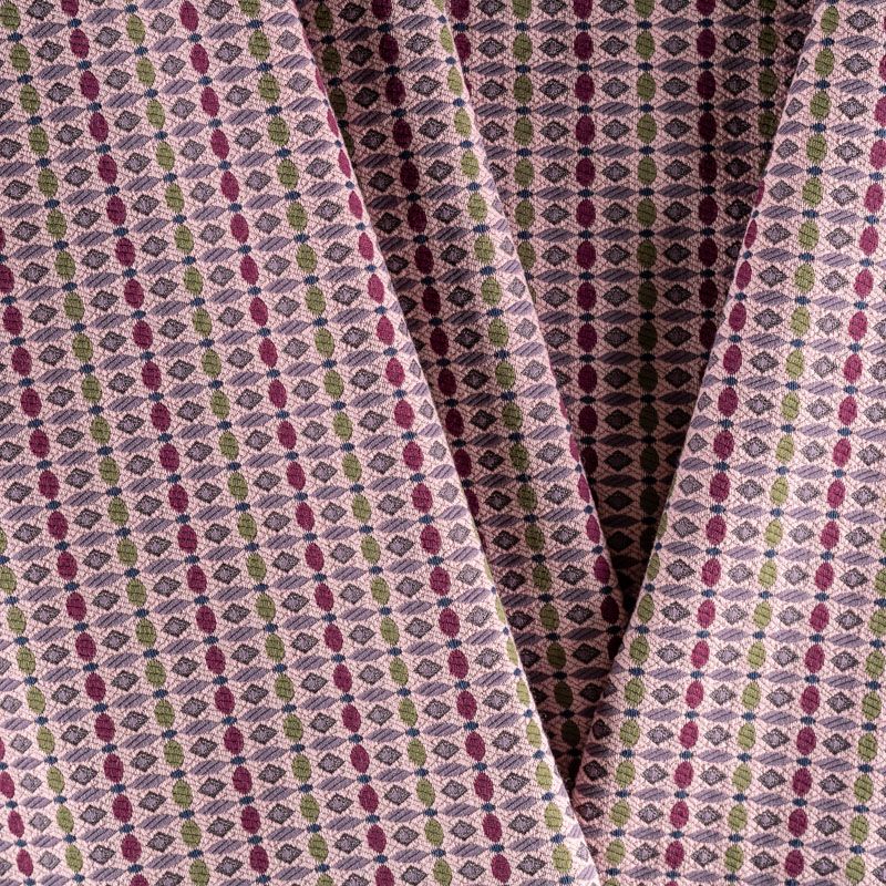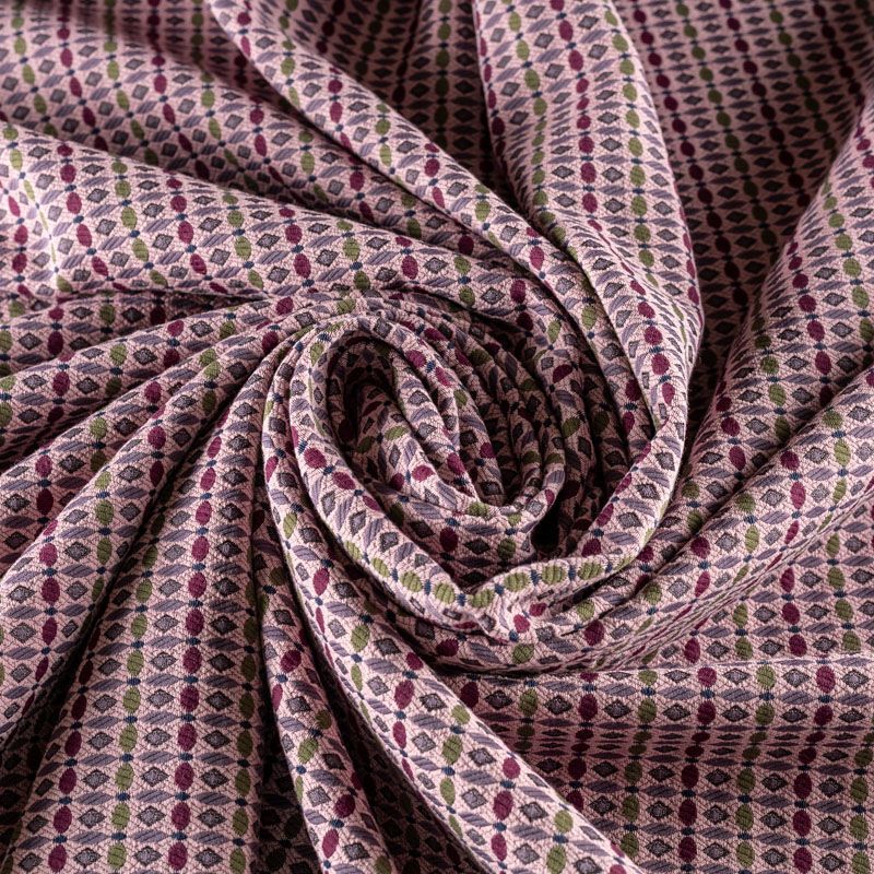 Мягкий хлопковый жаккард в розовом оттенке с мелким абстрактным узором. Ткань пластичная, непрозрачная, приятная на ощупь, тянется за счет эластана в составе, форму не держит, но хорошо драпируется красивыми складками. Будет комфортна для пошива костюма, женственного платья, юбки или брюк.