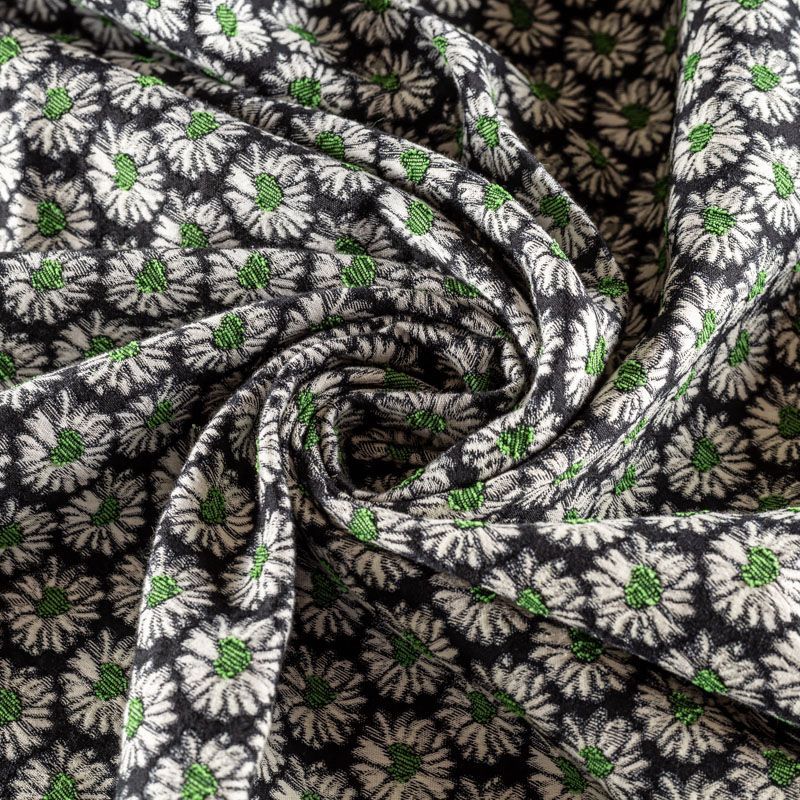 Итальянский набивной хлопковый жаккард с цветочным дизайном. Ткань средней плотности, поверхность матовая,фактурная, хорошо драпируется и держит форму, тянется за счет эластана в составе, не просвечивает. Подойдет для пошива повседневных костюмов, платьев-футляров, жакетов, топов, летних пальто, бомберов, юбок или шорт.